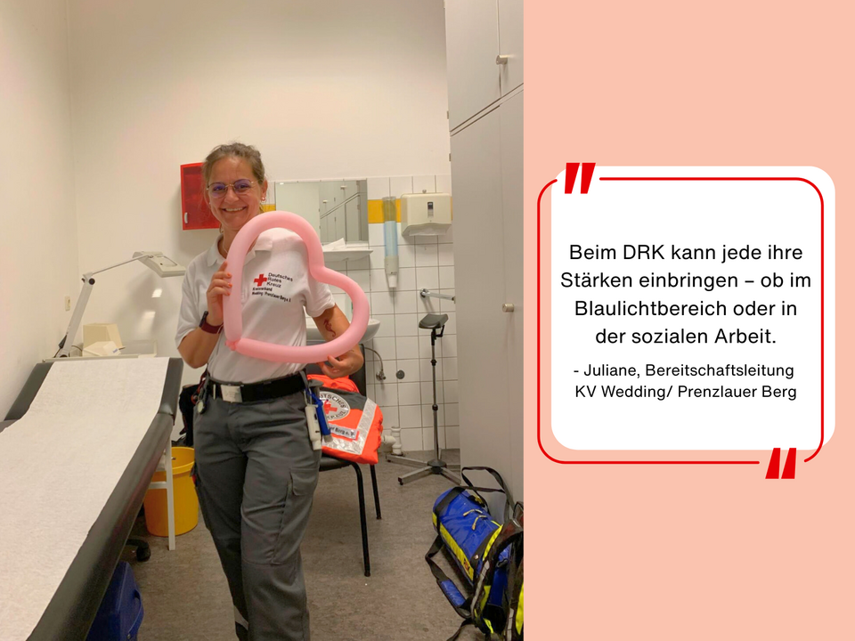 Juliane engagiert sich seit 2022 ehrenamtlich im DRK und ist in mehreren Fachdiensten aktiv. Seit 2025 leitet sie ihre Bereitschaft, bildet Pflegeunterstützungskräfte aus und fährt im Winter den Wärmebus. Hauptamtlich arbeitet sie seit 2024 im Landesverband Berlin.