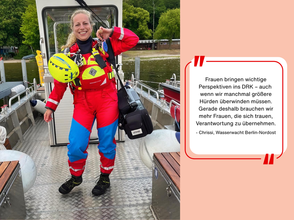 Chrissi ist seit 2003 im DRK aktiv – zunächst in den Bereitschaften, seit 2007 in der Wasserwacht Berlin‑Nordost. Zehn Jahre lang war sie Kreisleiterin, heute koordiniert sie die Ausbildung. Beruflich arbeitet sie als Ärztin.
