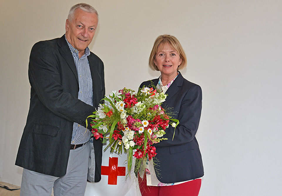 Volker Billhardt begrüßt seine Nachfolgerin Gudrun Sturm mit einem Blumenstrauß. (Foto: Anja Höfer /DRK)